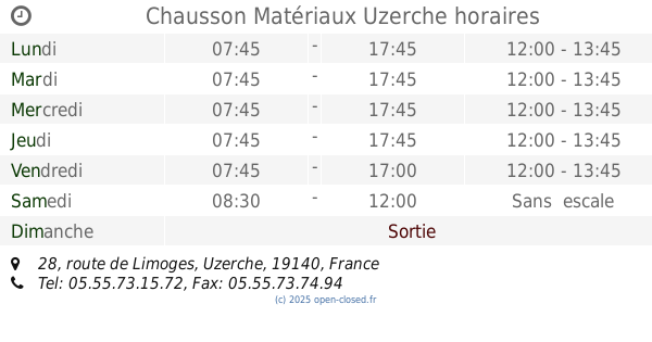 It is also possible to : Modifier ces HEURES D'OUVERTURE of Store Chausson Matériaux Dans Uzerche, 28, route de Limoges,